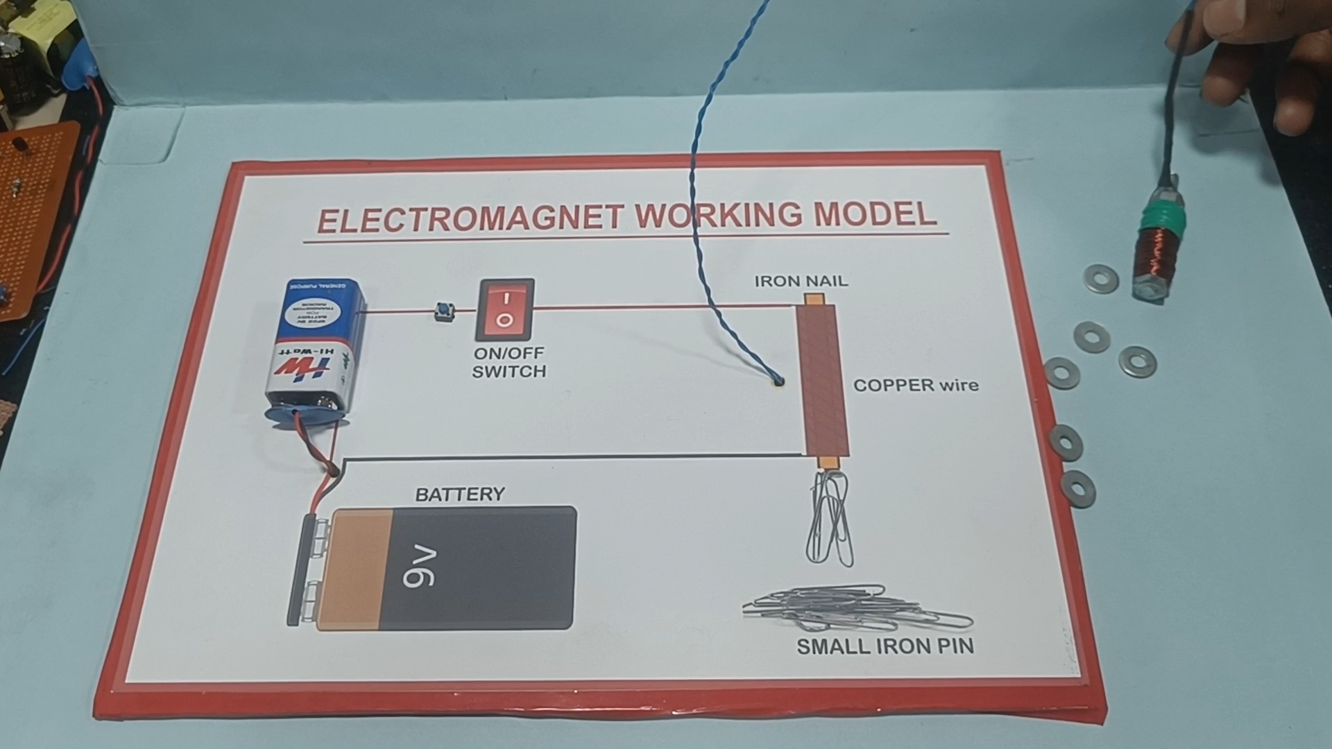 This project demonstrates the working principle of an electromagnet based on Electromagnetism. The model consists of a 9V battery, an ON/OFF switch, connecting wires, a copper coil wound around an iron nail, and small iron pins.